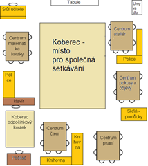 Prostředí třídy je uspořádáno do učebních koutů, které jsou různě tematicky zaměřeny a vybaveny k podněcování dětí k učení, najdeme v nich různé materiály (encyklopedie, knihy, pomůcky, učebnice, pracovní sešity, výtvarné potřeby, hry, atd…). Poskytují prostor pro samostatnou práci i pro práci ve skupinách. Děti se v nich učí od sebe navzájem, nápodobou a pozorováním. Tím, že pracují v malých skupinách, mohou spolu přirozeně komunikovat, řešit problémy, rozhodovat se, procvičovat si vyjadřovací schopnosti apod.